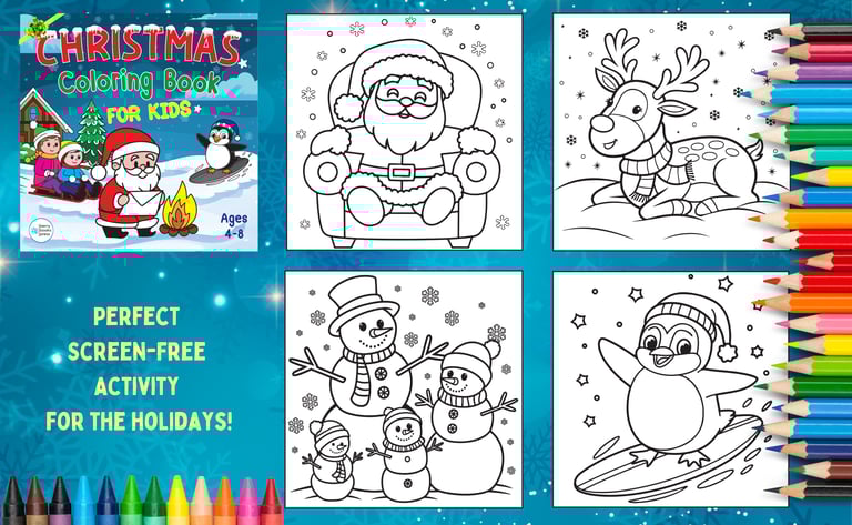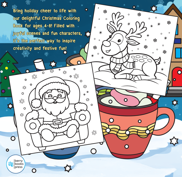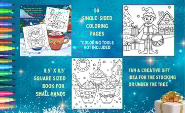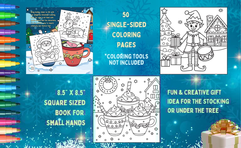 Get ready to spark joy, creativity, and hours of festive fun with this perfect holiday companion for your little artist! Filled with charming winter scenes, jolly Santa adventures, adorable elves, cozy fireplaces, snowmen, reindeer, and more, this book is designed to spread cheer all season long!