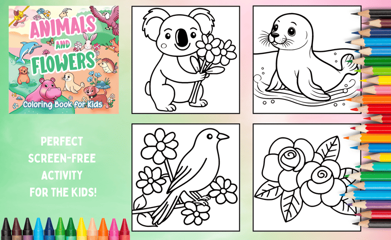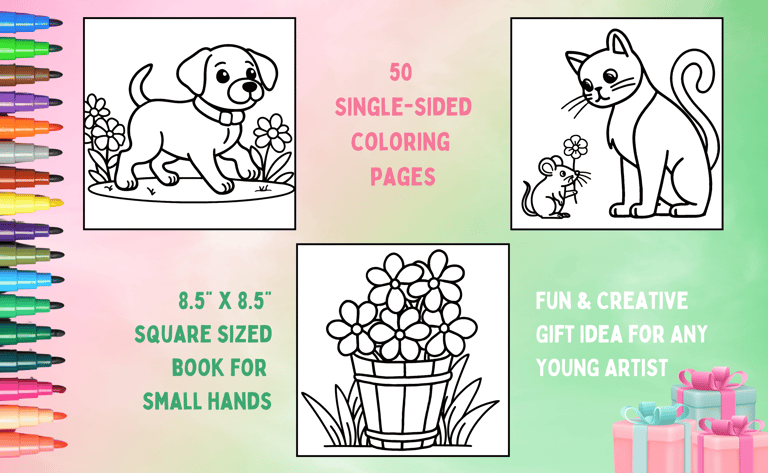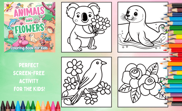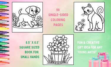 Have fun coloring with our Animals and Flower Coloring Book! Full of cute animals and flowers, this book is great will keep kids busy and creative. At 8.5 x 8.5 inches, it's just the right size for small hands to color comfortably. Whether you're giving it as a gift or using it for a fun activity, this book will become a go-to favorite!