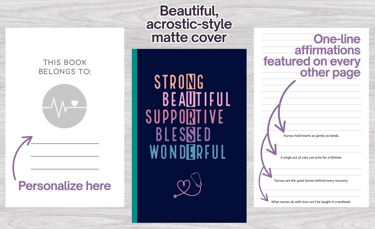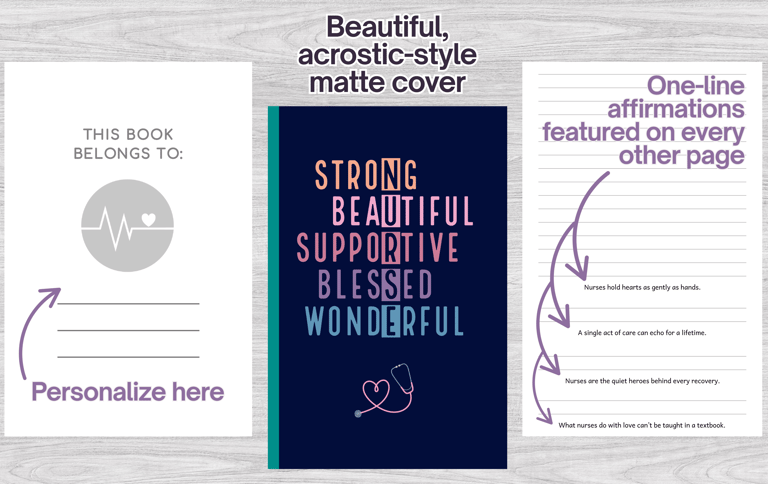 This acrostic-style nurse notebook is a tribute to the superheroes in scrubs—strong, beautiful, supportive, and blessed. Filled with uplifting one-liners on every other page, it’s the perfect blend of function and inspiration. Ideal for nurse gifts, medical student notebooks, or daily shift logging. Show your appreciation for the nurse who makes a difference with a journal that reflects the heart behind the hustle.