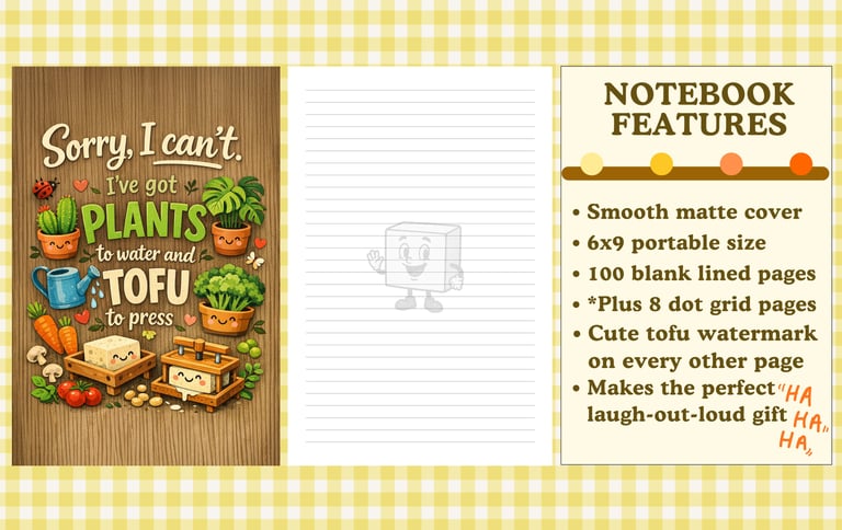 A notebook that has a cover title that's funny, sparks joy and is a guaranteed conversation starter. Perfect plant-based gift for vegans, vegetarians and anyone who loves green humor and cute, cozy, cottage-core style aesthetics. Get yours on Amazon today!